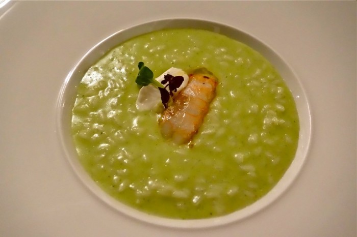 Riso Carnaroli “Riserva San Massimo” mantecato al formaggio di capra, pino mugo e scampo: interessante accostamento, il sapore è convincente, meno il profumo, troppo intenso quello del formaggio, che mal si accosta a quello dello scampo, col pino che non basta ad accordarli.