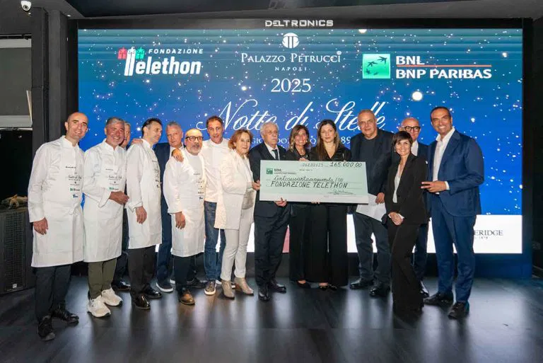 L’assegno, firmato da Ruxandra Valcu, Chief Commercial Officer di BNL-BNP Paribas, è stato consegnato a Samuela Mortara, Head of Strategic Partnerships di Fondazione Telethon, nel corso della breve cerimonia cui ha partecipato la famiglia Iaccarino – Alfonso, Livia, Mario ed Ernesto – del ristorante Don Alfonso 1890 a Sant’Agata sui Due Golfi.