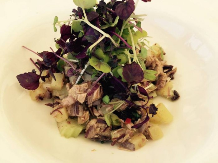 Ecco invece una bella insalata di tonno con erbe, germogli e sedano da innaffiare con un Ciro bianco ghiacciato:-)