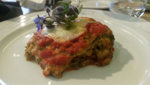 A seguire le divertenti ostriche di bosco (in realtà: foglie di borragine fritte), un gustoso antipasto, servito al cartoccio e poi si passa ad un suo cavallo di battaglia: la parmigiana di borragine, molto golosa, uno di quei piatti che ti vien quasi voglia di bissare; se siete curiosi, la ricetta è qui.