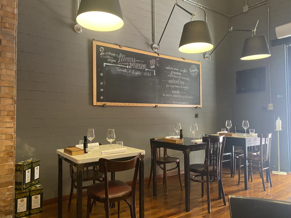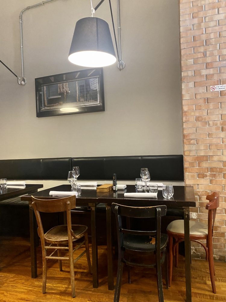 L’ambiente è bello, da osteria moderna, con echi classici, come le sedie, i tavoli, l’utilizzo del marmo per il bancone e l’atmosfera familiare con l’esposizione di alcune materie prime, la cucina a vista.
