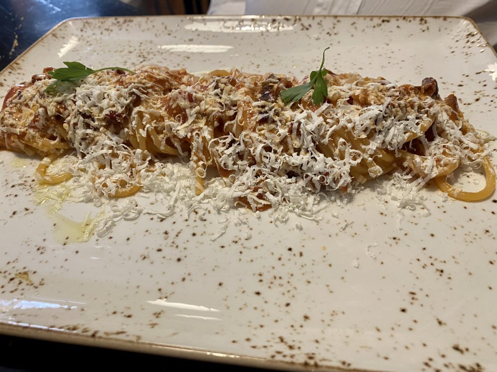 C’è l’imbarazzo della scelta sui primi piatti, dove la pasta secca a marchio Di Martino, è impiegata quasi al 100%. I Vermicelli con aglio rosso di Nubia, pomodoro secco, finocchietto e ricotta salata di Montella, risuonano di semplicità e di gusto. Poi il Pollo alla cacciatora (erano anni che non lo mangiavo al ristorante), scomparso praticamente da qualsiasi menù.