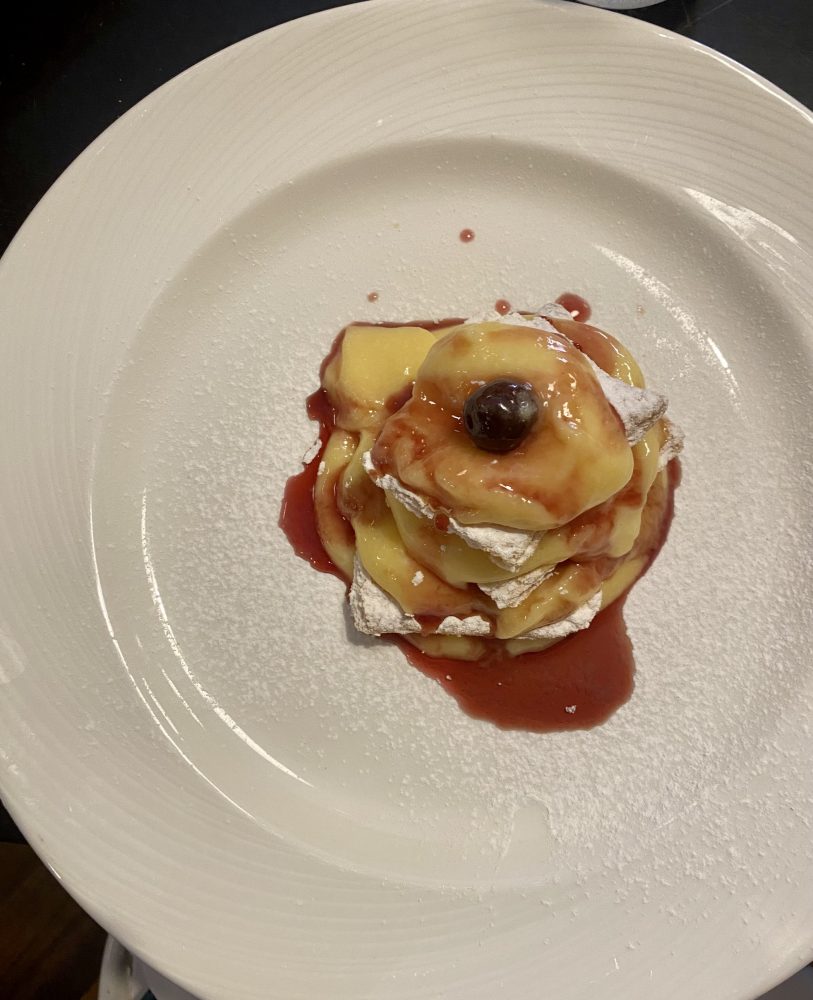 Per il dessert, non si va molto lontano dalla proposta salata: tiramisù; pane, ricotta e limone sfusato; millefoglie, crema pasticcera e amarene di Pontelatone.