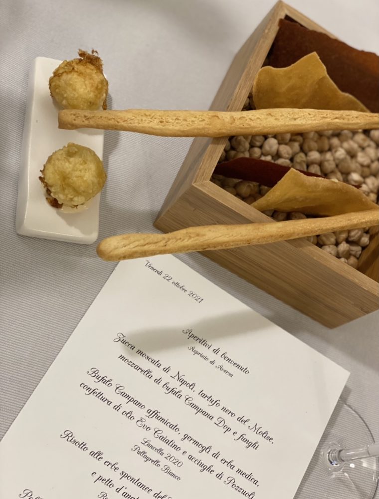 Gli assaggi di benvenuto sono stati accompagnati da un calice di Asprinio Brut Spumante dell’Azienda Diana di Casapesenna. A seguire una delicata zucca moscata di Napoli declinata al tartufo nero del Molise, mozzarella di bufala campana Dop e funghi.