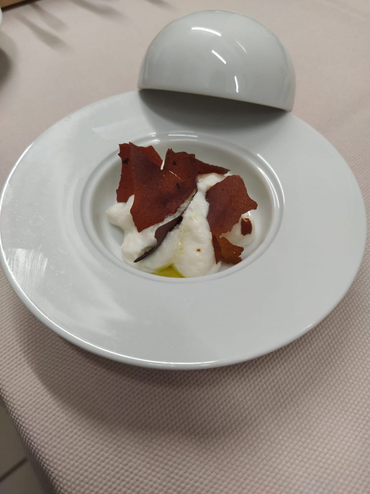 Accattivante il bufalo campano affumicato arricchito da germogli di erba medica, confettura di olio Evo caiatino e acciughe di Pozzuoli. Un assaggio interessante e gustoso in una raffinata esecuzione in abbinamento al Lancella 2020 Pallagrello Bianco ( Cantina di Lisandro).