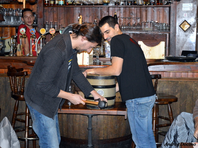 Una serata davvero piacevole, e molto “amusing” è stato il momento in cui Strianese, coadiuvato da Polini, si è cimentato nella “apertura” di una delle botticelle (che pure hanno avuto l’onere di contenere le prime cinque birre esaminate) mediante martello, seguendo l’antica pratica della mescita “a cascata”.