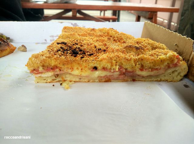 Sulla base c’è uno strato di prosciutto cotto, seguito da uno di mozzarella, poi il salame napoletano, sempre abbondante ed infine la purea di patate ed il pangrattato (artigianale, of course) creano una meraviglia per gli occhi e per il palato. Sarà anche super lipidica, ma non provarla è un reato!
