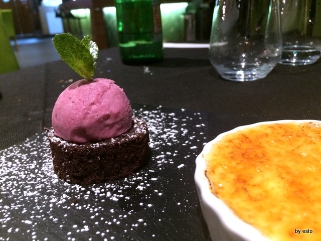 Gelato di frutti di bosco con pane di cioccolata e créme brulé.