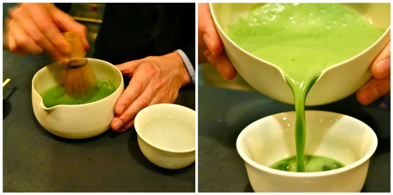 Come accompagnamento ai dolci scegliamo il The Macha, che viene preparato davanti a noi, sbattuto con una speciale frusta di bambù.