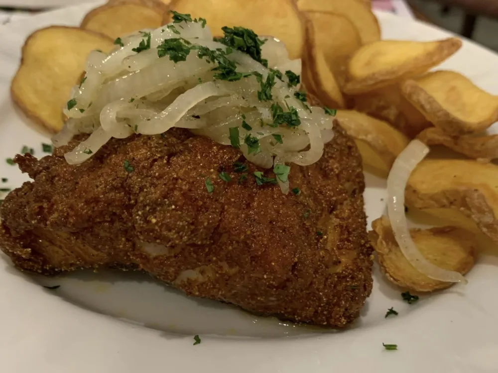 Benvenuto goloso e appagante con le frittelle di baccalà, pataniscas, asciutte e croccanti. Bella esecuzione per il tradizionale Bacalhau à Bras, una sorta di pasticcio di baccalà, con patate fritte e uova; così come la preparazione tipica di Minho (siamo nel Nord del Portogallo), con patate e cipolle fritte: pesce ben sfogliato, con una panatura perfetta.