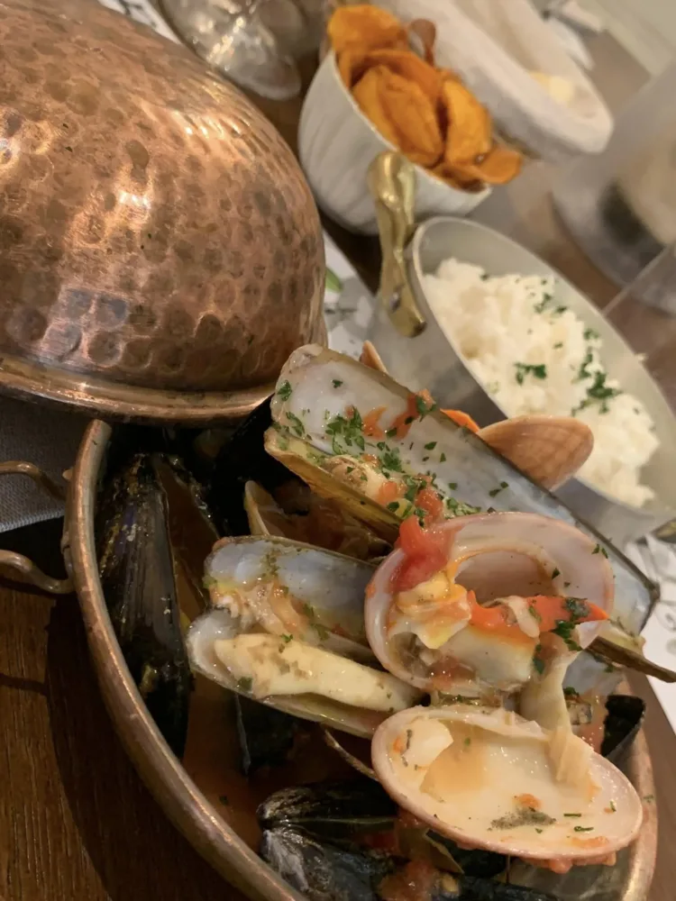 Interpretazione lieve e dunque contemporanea della ‘cataplana’ lo stufato di baccalà con frutti di mare e verdure che viene cotto nella pentola sferica tipica della regione meridionale dell’Algarve. Qui al Boteco più che uno stufato è quasi un’acqua pazza’, dal sapore delicato e accompagnato da riso bianco al cocco e patate dolci.