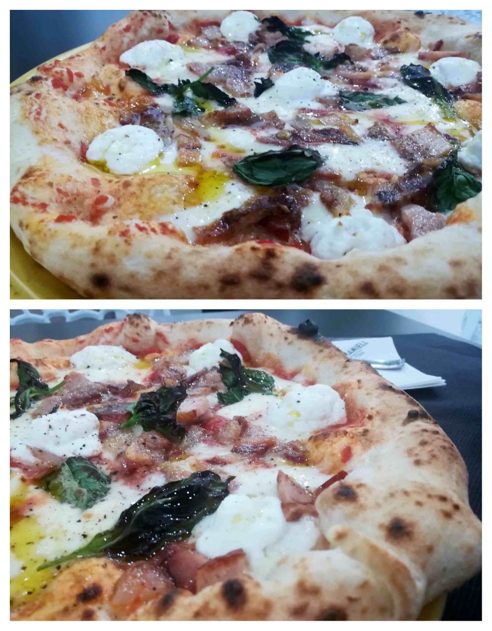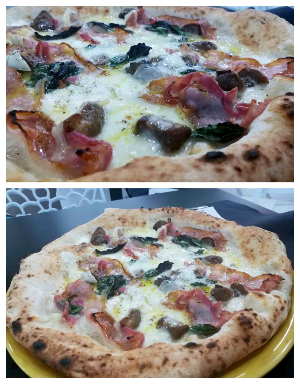 Prima di entrare in sala, dando uno sguardo sui social, ci siamo fatti tentare dalla Ciccianese (7,00 euro) con Porcini, Pancetta di maialino nero e scaglie di Caciocavallo Irpino. La invitante Pancetta pepata arrotolata che avevamo visto probabilmente era finita sul banco pizzeria e veniva sostituita con della pancetta tesa. Poiché ci avevamo messo il pensiero su quella arrotolata facciamo notare che avremmo preferito una realizzazione come quella della foto, così il pizzaiolo per scusarsi dell’accaduto e per far constatare la qualità dei prodotti utilizzati porta personalmente un piattino con la pancetta tesa a crudo ed il caciocavallo irpino.