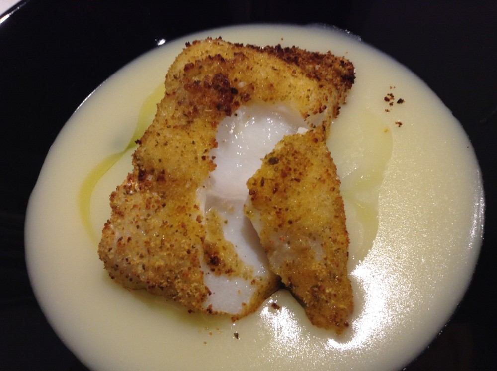 Filetto di merluzzo al forno in panatura aromatica su crema di patate, uno dei tre secondi proposti a pranzo ad un cifra davvero vantaggiosa soprattutto in rapporto alla qualità dell’offerta, pesce bianchissimo, senza macchia come questa preparazione che sul fondo del piatto nasconde anche una nota vegetale, piattoni, supporto fisico e gustativo del merluzzo