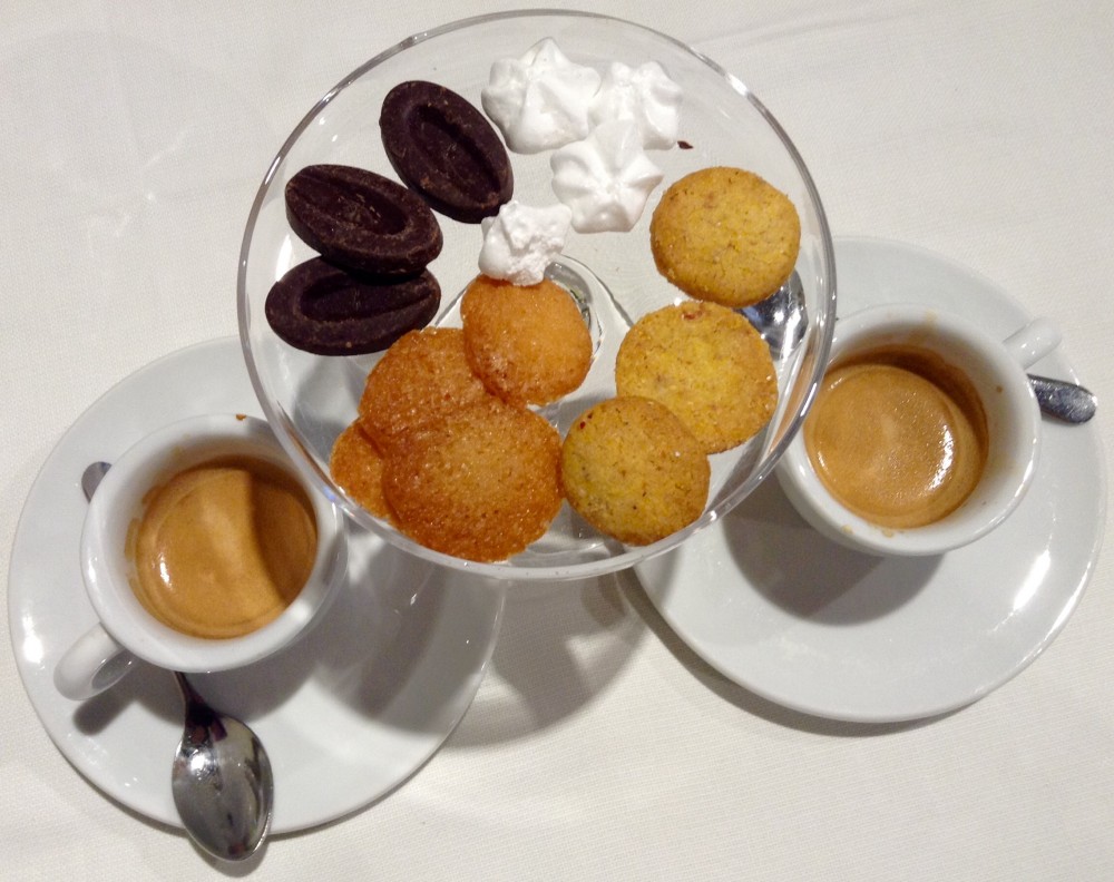 Strudel di pere allo zenzero, macadamia e gelato al cioccolato fondente, forse l’unico piatto un po’ sotto tono, ma il mio termine di paragone è lo strudel di Walter Stuerz, probabilmente quindi sono troppo esigente