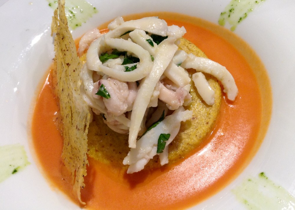 Seppia tiepida (tenerissima), emulsione piccante di pomodoro, crostino di polenta di Storo