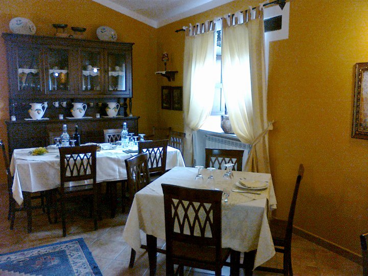 Non provate neppure a chiedere a Donatella di fermarsi. Il resto è già pronto. E tutto quello che potreste ricavarne è il suggerimento di fare due passi fuori, all’aria fresca, prima di ri-cominciare. Che pranzo di domenica è senza ragù? Cotto per ore e ore, con carni miste a condire i ravioli di ricotta. Sapori forti, duri, decisi: dimenticatevi le anemiche paste ripiene di città. E anche quando il primo piatto è delicato, come i tagliolini con asparagi, carciofi, noci e pinoli vi divertirete ad annusare e riconoscere fragranze e profumi. E ancora coniglio in umido, le patate «impaccate» con uno strato sottilissimo di uova e formaggio, le cicorie in padella, i carciofi spaccati e ripieni. E infine il piatto che da solo vale la spedizione: il roastbeef di bufalo. A metà tra arrosto e stracotto, con dentro un giro di carote e cicorie, aromatizzato con bacche di ginepro. Una carne eccezionale, cottura perfetta. Il vero colpo di genio di Donatella.