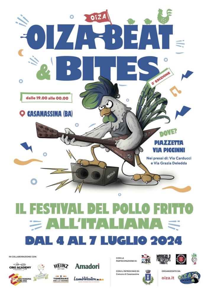 con il patrocinio del Comune di Casamassima e vede la partecipazione di partner come Cibo Academy e Paoletto Gelateria. Inoltre, con la partecipazione de I Temerari della Birra non mancheranno fiumi di birra ogni giorno da tutto il mondo, garantendo una varietà di sapori unica.Antonello Pascazio, fondatore di Oiza Chicken, ha voluto riproporre questo festival nella sua città per presentare una nuova visione gastronomica del pollo fritto. Dopo l’enorme successo della prima edizione, con 4500 presenze e 2000 chili di pollo fritto consumati, Pascazio ha dichiarato: «La scorsa edizione è stata un’anteprima, un vero e proprio corso di formazione. Quest’anno abbiamo alzato notevolmente il livello». L’obiettivo per quest’anno è superare i risultati eccezionali dell’anno scorso, confermando Oiza Chicken Beat & Bites come un evento imperdibile.