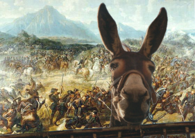 Questa foto simboleggia alcuni protagonisti dell’olivicoltura sannita: mentre si combatte la battaglia del mercato globale il nostro ciucciarello spera di scansare i colpi mentre si domanda: <Cosa sta succedendo?>.