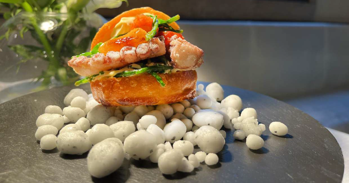 Sulla base del piatto disporre i “sassi di mare” e su questi adagiare il bun allo zafferano farcito con la maionese al Gin, la salicornia, il tentacolo di polpo fritto ed il tris di pomodorini.