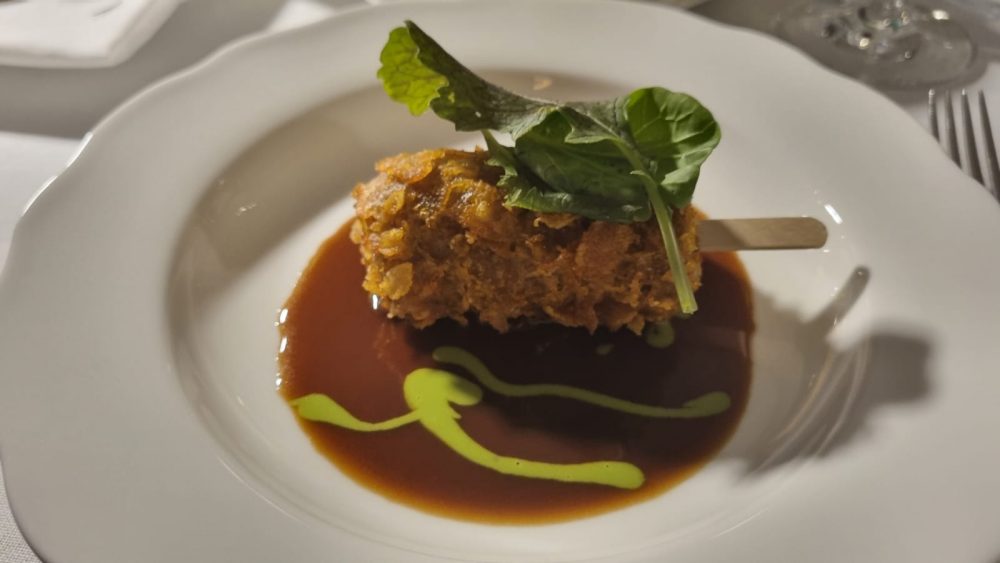 Il primo è un tuffo nei sapori dell’infanzia, una giostra di immagini nostalgiche che riportano in vita sapori dimenticati e difficilissimi da trovare in carta in un ristorante. Il croccante di Coda alla Vaccinara invece, fritto e servito con il suo fondo e una cremina alla rucola, è una bellissima sfida vinta dallo chef per gusto, presentazione e divertimento rispetto ad un piatto spesso scartato e vittima di pregiudizio.