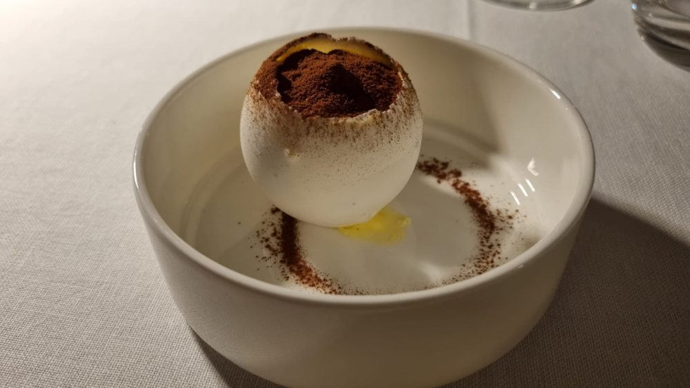 Il clima che si respira è molto familiare e piacevole, a tratti anche ludico e ci si sente a casa in una casa che ha la fortuna di potersi affacciare su una Roma sorprendentemente bella e serafica mentre si gusta un ottimo Ovo…Misù, dolce dello chef (che ne ha registrato il marchio) e considerato sua massima espressione (visto che in principio Fabio Pecelli nasce pasticcere e poi diventa chef) in cui un uovo di meringa contiene un ottimo tiramisù tradizionale fatto con crema al mascarpone e uovo pastorizzato con lo sciroppo a 120° e un savoiardo fatto in casa bagnato al caffè.