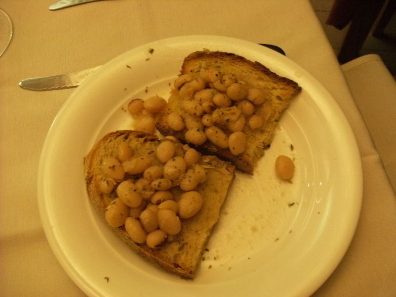 S’incomincia con una squisita, deliziosa e semplice bruschetta di pane casereccio con sopra fagioli lessi locali conditi con olio extravergine di oliva delle Colline Salernitane, che apre lo stomaco alle portate successive. Mi fa ricordare la mia infanzia, quando mamma mi preparava il “cozzotiello” di pane proprio ripieno di fagioli lessi, olio e sale e chiuso con la mollica.