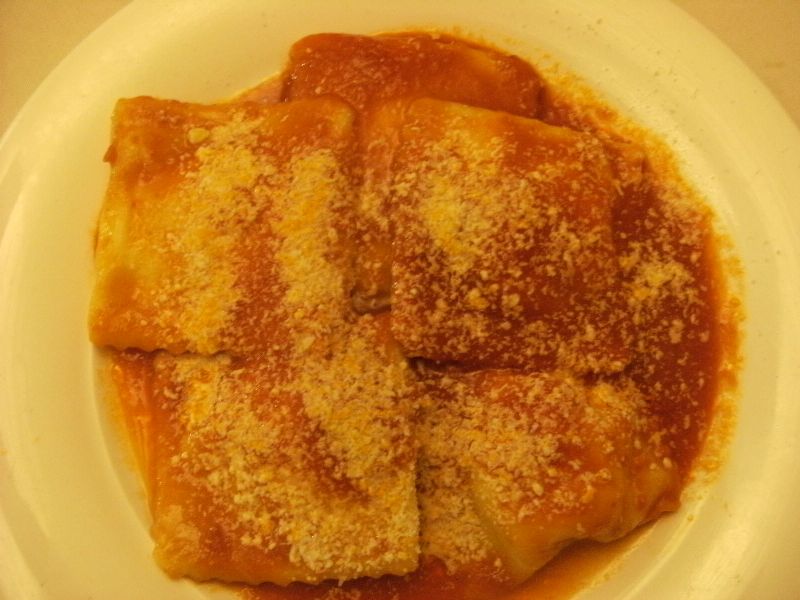 Tiempe belli ‘e ‘na vota! Due portate per il primo: profumati, invitanti, grossolani ed abbondanti ravioli, ripieni di candida ricotta vaccina del luogo e conditi con sugo di pomodoro e spolverata di ottimo pecorino.