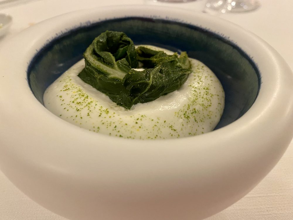 Tra i miei piatti preferiti della serata l’antipasto fatto con salsa di cavolfiore cilentano IGP con salsa di pane, crumble di pane, salsa alle sette erbe e alici maturate. Benché si tratti di fine dining dove l’eleganza e il bon ton la fanno da padrone, vi confesso di aver fatto la scarpetta, mi perdonerete. A proposito di pane, la selezione proposta è da manuale.
