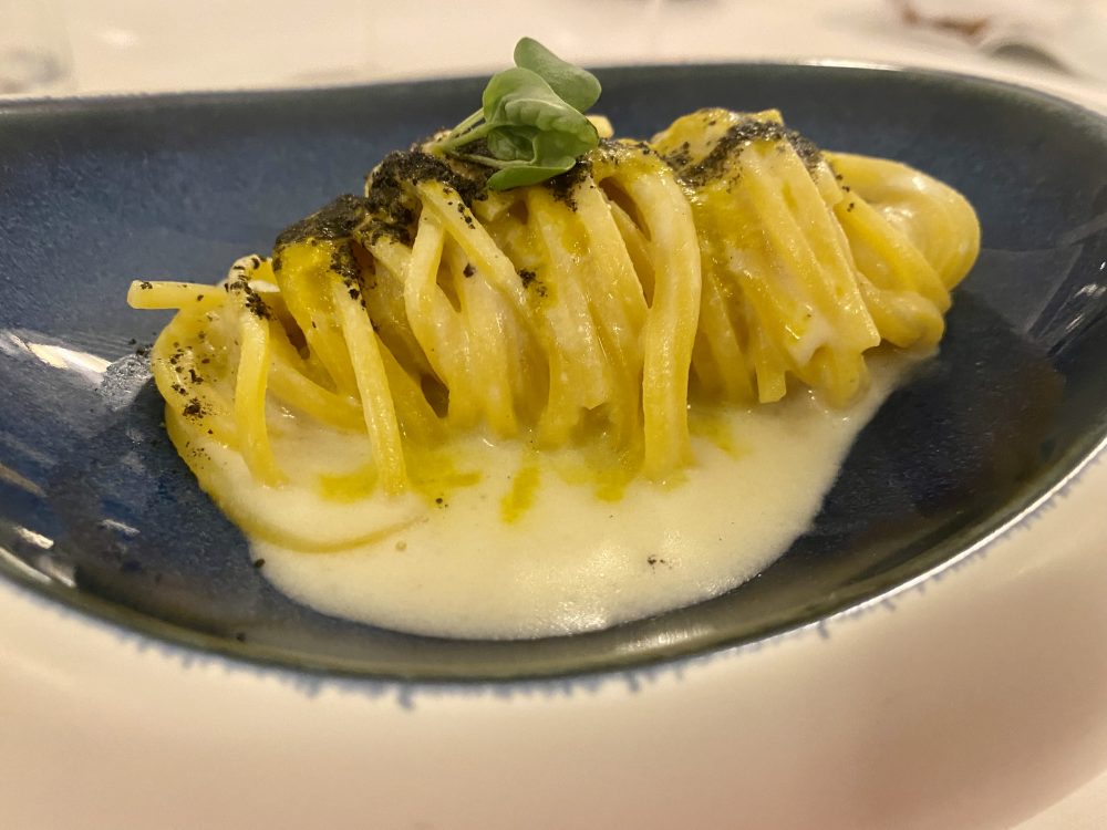 Oltremare Rooftop -Chitarrine con caciocavallo podolico dei Monti Lattari, finocchietto in polvere, colatura di alice di Cetara e fiori di zucca.