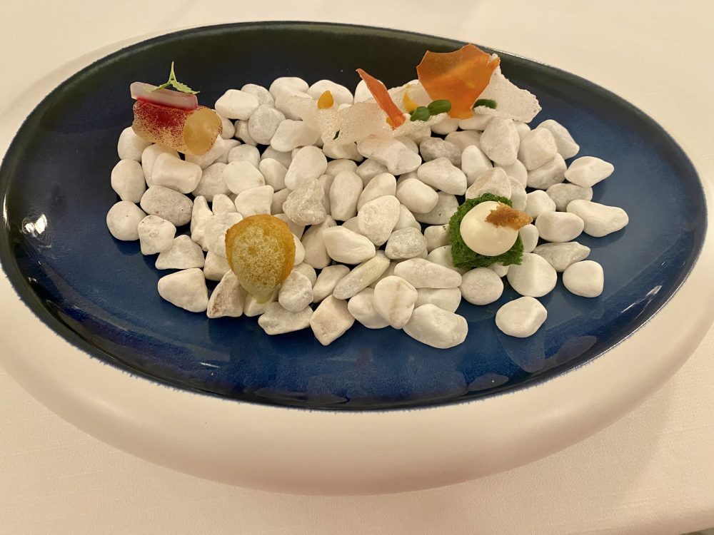 Dalla cucina arriva l’entrée che gioca su sapori ben riconoscibili: sfera di parmigiano puro 36 mesi, mostrarda di arancia e liquirizia; cannolo croccante con tartare di baccalà crudo e pesca; frollina salata con mousse di avocado e pellicola di latte, cocco e vaniglia, ed infine ostrica arrostita laccata con corallo di gamberi bruciato, maionese di crostacei e spuma di lime.