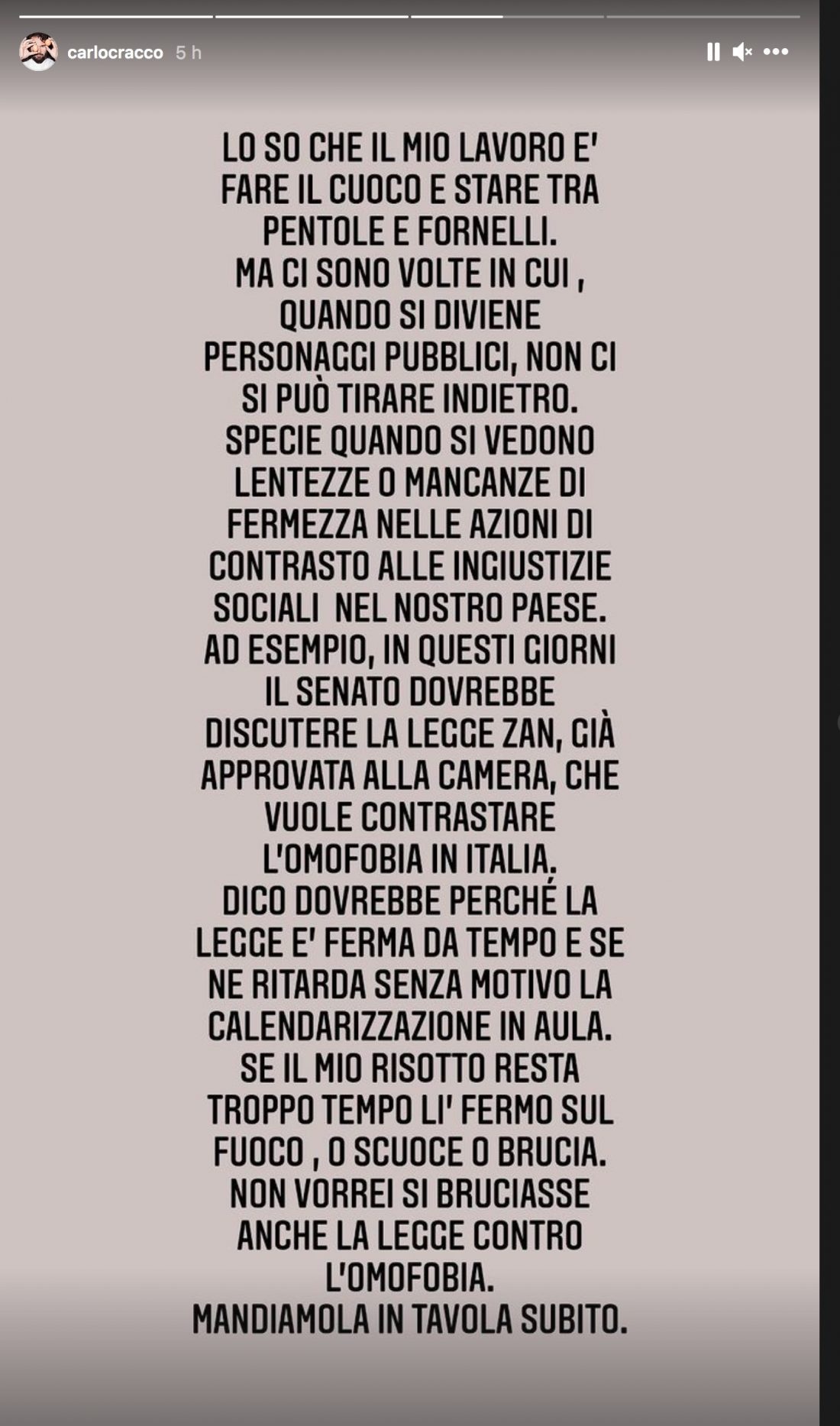 Carlo Cracco scende in campo con un post sulle stories di Instagram: basta omofobia, apporvate al Senato la legge già passata alla Camera.