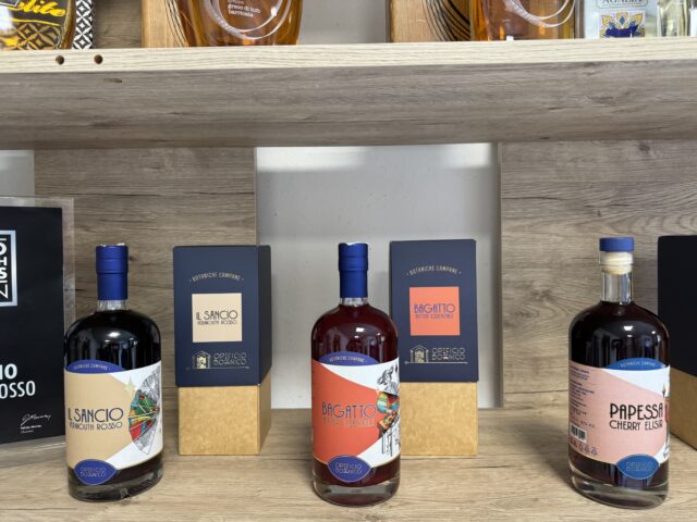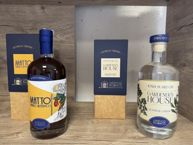 Il Sancio, un vermut rosso ottenuto da vino Pallagrello bianco e Pallagrello rosso, unito all’infusione del brandy di assenzio, foglie di mirto, alloro, coriandolo, cardamomo, chiodi di garofano e genziana. Infine, non si può non menzionare il Gardener’s House London Dry Gin, dedicato a Gradfer, il giardiniere del Giardino Inglese della Reggia di Caserta. Ottenuto attraverso la distillazione a bagnomaria discontinuo di ginepro, foglie spontanee di mirto, alloro e cardamomo, è un altro rappresentante del territorio di Caserta, non solo per le materie prime impiegate, ma anche come legame alla storia della città vanvitelliana. La Papessa, invece, è l’ultima creatura nata in casa Opificio Botanico e vede la macerazione di amarene e di ciliegie marascate.