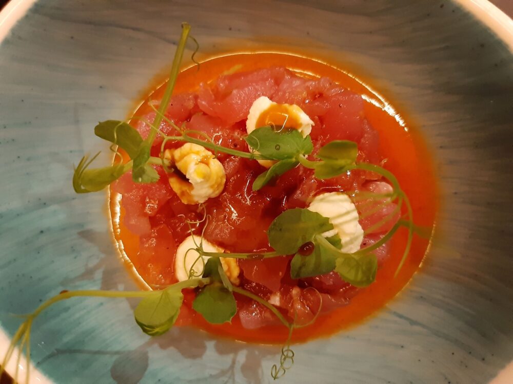 La serata di festa ha visto anche i piatti di Vito Sonnessa, dell’agriturismo La Villa di Melfi, con un delizioso cappuccino di salsiccia pezzente, crema di patate e schiuma di stracciatella, servito insieme al cornetto di semi di lino da “pucciare” in tazza. Il fratello Gabriele cura la sala per un’idea di cucina territoriale dove esaltare colori e sapori a chilometro zero.