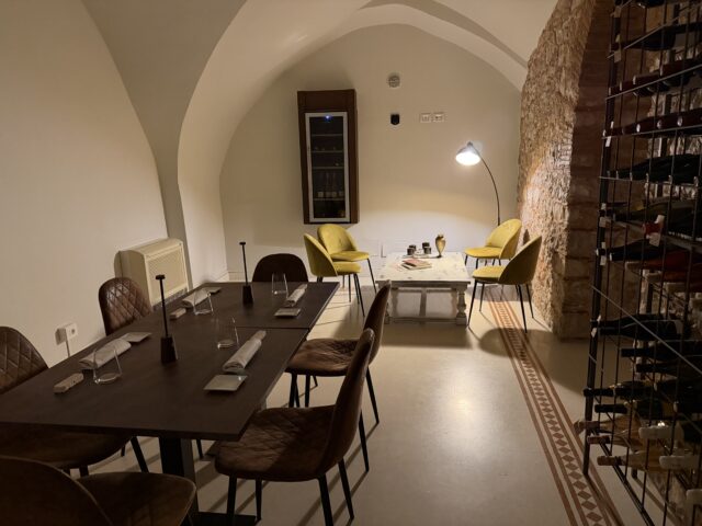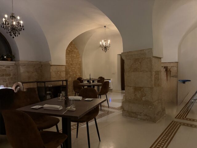 Il locale prende vita nei sotterranei di una chiesa del XIII secolo. L’attento restauro conservativo ha mantenuto intatto il legame con la storia: un tempo cripta dove i frati pregavano, oggi lo spazio è stato riprogettato dallo stesso chef. Volte antiche, affreschi dedicati a San Tommaso e pietra viva convivono con elementi di design contemporaneo: tavoli in corten, tonalità calde, designer pulito e poltroncine Frau. Luci soffuse e grandi lampadari in ferro completano l’atmosfera intima e riservata. Tutto molto essenziale, anche la musica è appena percettibile. In sala, il fratello di Lorenzo, Simone, gestisce i tavoli con un servizio curato ma non ingessato. Ogni piatto servito è spiegato direttamente dallo chef, creando un rapporto diretto e personale con gli ospiti, ragione per cui i coperti sono limitati a 15, nonostante lo spazio permetta un ampliamento.