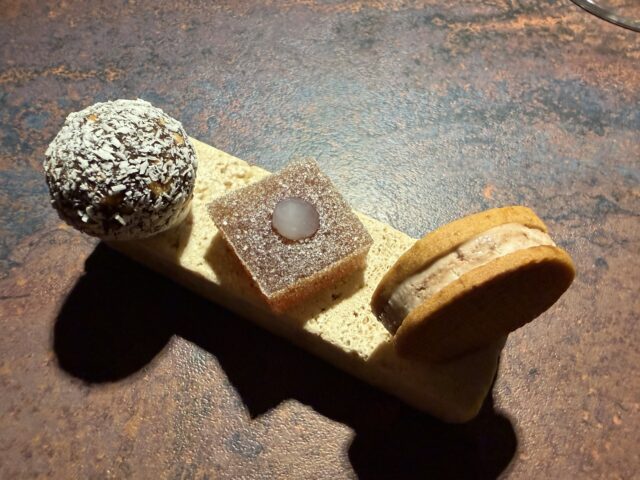 Ricordo del cucciolone (frollino con stracciatella e vaniglia), caramella all’uva fragola, pepe e melograno, bon bon di cioccolato fondente, anacardi e cocco.