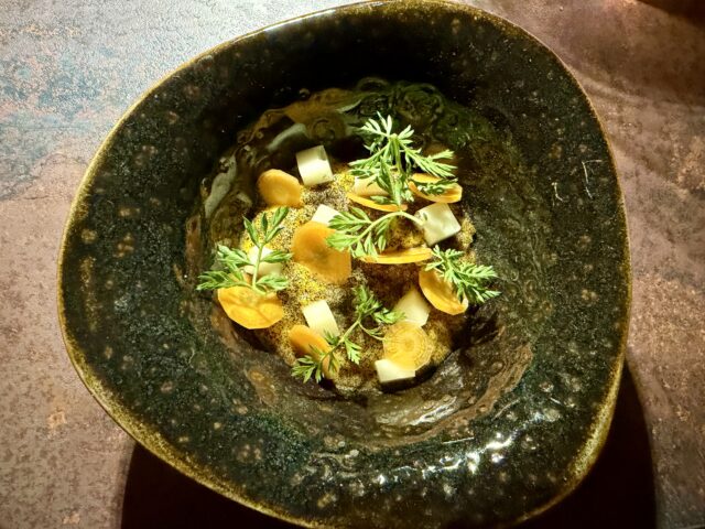 Risotto riserva San Massimo, assoluto di carota, agrumi, capra. Il risotto viene cotto in un brodo vegetale, mantecato con crema di carota acida; alla base del piatto, agrumi tagliati a vivo; termina il formaggio di capra, le carote marinate e la polvere di lapsang souchong