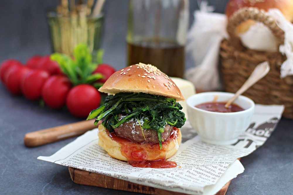 In una padella, fate saltare la vostra verdura con dell’aglio e del peperoncino (è preferibile saltarle fresche senza sbollentarle). Formate gli otto medaglioni di carne, salate con del fior di sale e cuocete in una padella calda a fuoco vivo per circa tre minuti per lato al fine di ottenere una cottura al sangue. Tagliate a metà i buns, dorateli per qualche minuto in padella e poi andate a farcirli. Spalmate alla base la confettura di pomodoro, sovrapponete l’hamburger, il cacioricotta e le verdure saltate. Terminate con la parte superiore del bun spalmato con dalla senape.