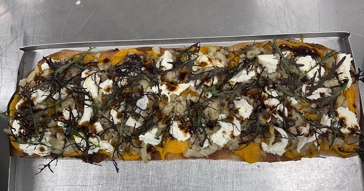Sulla base della pizza, stendere un leggero strato di crema di zucca ed aggiungere i finocchi spadellati, la provola sfilacciata a mano e le foglie di senape. Glassare infine con il fondo bruno vegetale e un filo di olio extravergine di oliva.