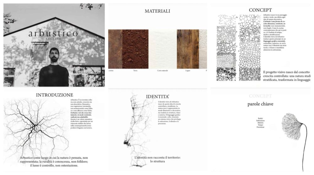 L’identità è fatta di natura non decorativa, ruralità colta e contemporaneità silenziosa. “Non ristorante stellato immerso nel verde ma luogo di ricerca gastronomica integrato nel paesaggio. Un progetto visivo che nasce dal concetto di crescita controllata: una natura studiata, stratificata, trasformata in linguaggio”. Non mancano le parole chiave del concept: Radici, sottrazione, materia, tempo, precisione. E i materiali: dalla carta naturale alla terra, al legno e ancora acciaio cortem e pietra che si ritroveranno all’interno degli spazi per un progetto di lavoro e di amore per il territorio che sicuramente si ritroverà nel menu di chef Torsiello.