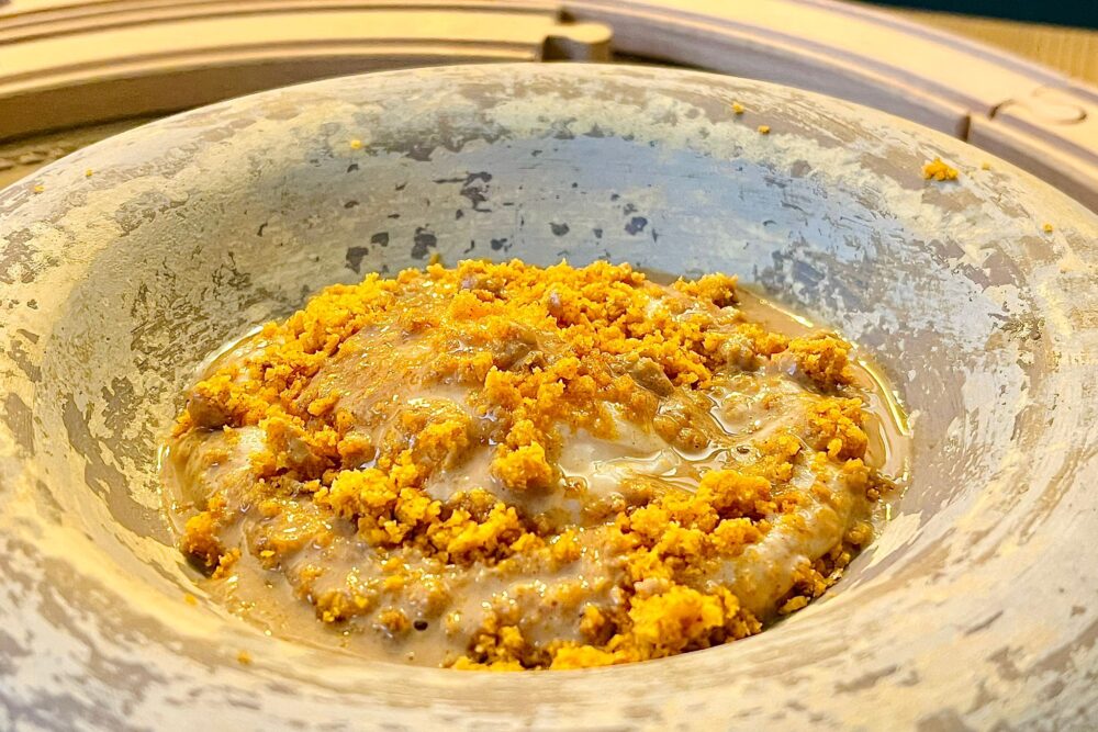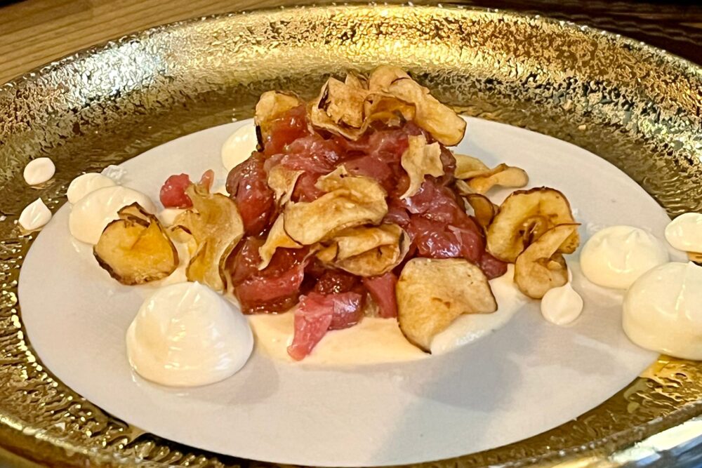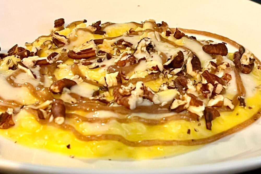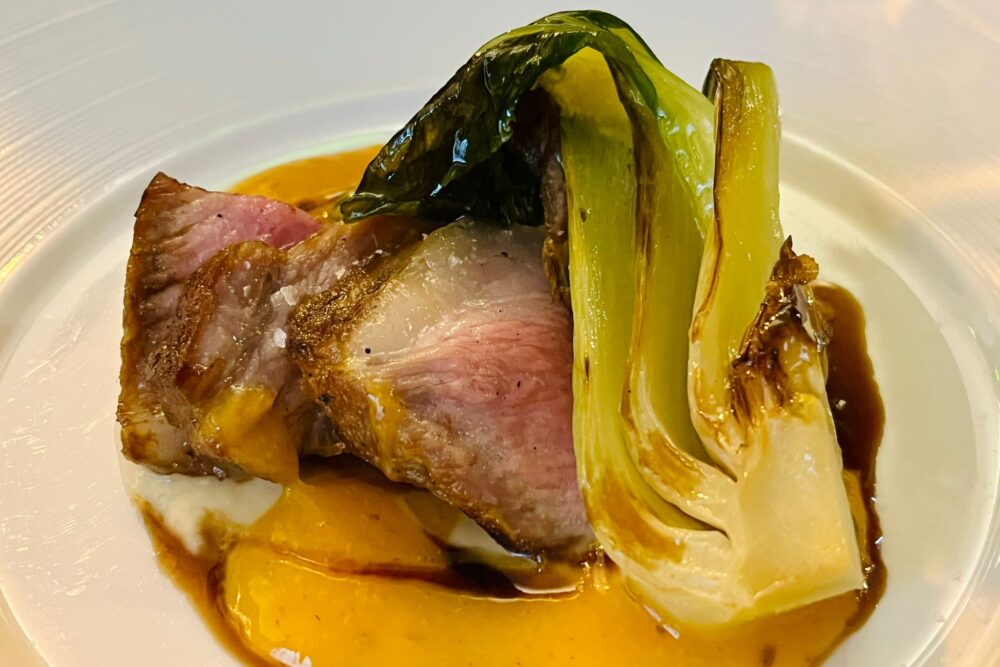 Il “Cintale” è invece un ibrido di cinta senese e cinghiale, dell’azienda Giusti (Lajatico), porri, patate, salsa di cachi, cavolo Pak-choi brasato. Una complessità che si rileva soprattutto nella scrittura, ma che risulta un’armoniosa melodia per le nostre papille. Ormai libero di camminare con le sue gambe, Madonia non dimentica nulla del suo lungo percorso e, più libero, azzecca toni, note, sensazioni. Lo fa per un numero ristretto di clienti, e questo giova a tempistiche e realizzazioni, sempre piacevoli anche alla vista.