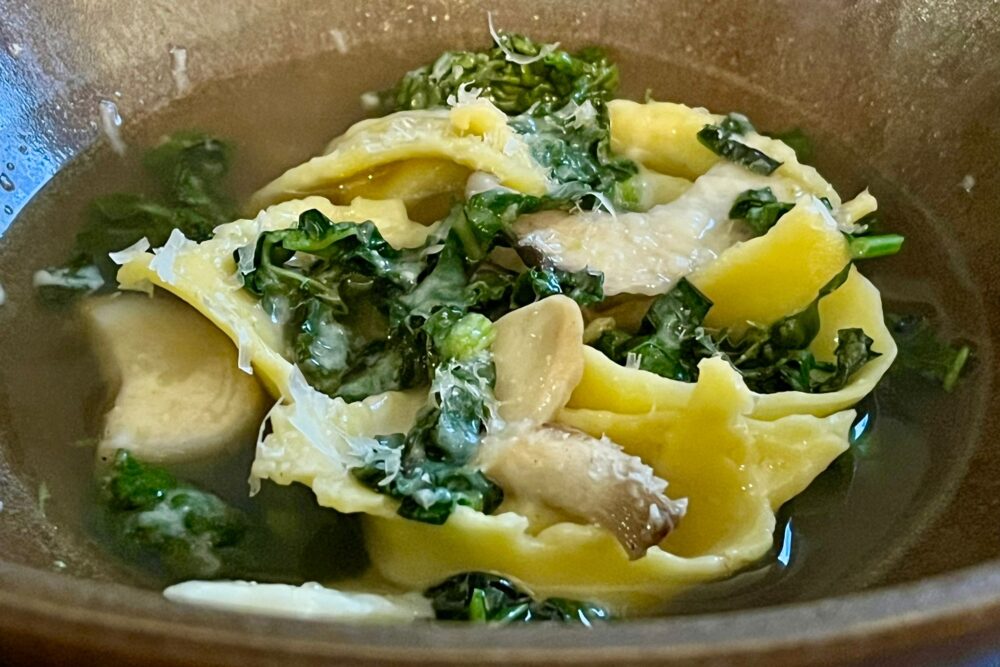 Contaminazioni, acidità, opposti che si attraggono. Andrea ha come scopo preciso quella salivazione che ti porta, curioso e eccitato, al piatto successivo. Che sono dei Tortellini ripieni di gallina e funghi su un brodo di gallina con cavolo nero e pecorino.