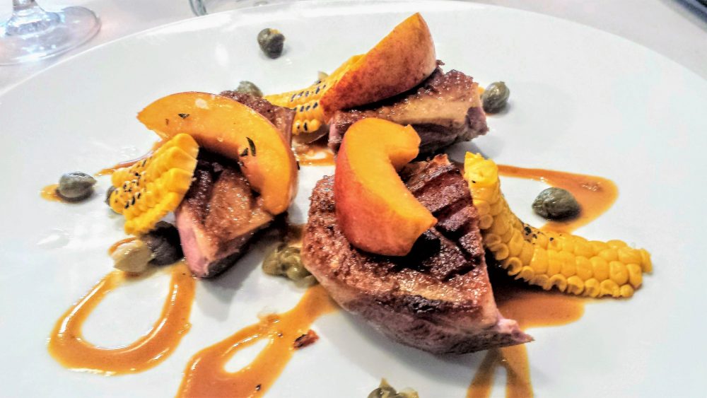 O.Brunello, Petto d’anatra rosa, pesche marinate al Campari