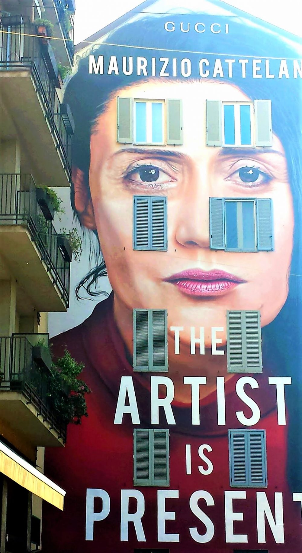 Marina Abramovic ci guarda con stanchi occhi da lupa. Il suo ritratto, una istantanea al tempo della performance The Artist is Present al MoMa, è diventato un murale grande come il palazzo che si affaccia su Corso Garibaldi, sopra gli ombrelloni, sopra i tavoli, gli aperitivi, i sandali e le scarp de tenis colorate. Su quella che a tutti gli effetti è ancora la Milano da bere. Due finestre sono aperte all’altezza della sua fronte: quanto basta per leggere di Maurizio Cattelan e Gucci, quanto basta per googlare che di queste installazioni ne sono state allestite solo quattro nell’orbe terracqueo, quanto basta per realizzare che stai camminando in prossimità dell’ombelico di un mondo che probabilmente non è il tuo, ma che sicuramente se ne frega di te e ti passerebbe sopra, asfaltandoti non poco, proprio come il contorno occhi di Marina.