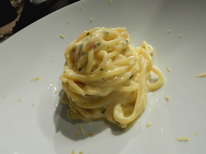 Proseguiamo con il Mezzo pacchero con fave, pancetta e mandorle tostate. Anche qui un bellissimo abbinamento di ingredienti, buon gioco di consistenze e ottima materia prima. Se fosse stato un pelino meno sapido….Potremmo smetterla qui, ma la bontà sin qui registrata e la fame arretrata di tre giorni di degustazioni , durante i quali il Pigna ci aveva tenuto a pane e acqua, lascia sciogliere ogni freno inibitore e…continuiamo imperterriti!!!