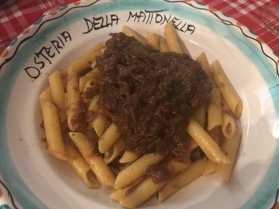Ecco come deve essere la genovese: cipolla imbrunita dalla lunghissima cottura lenta che si fonde con il pezzo di carne. Questa è una genovese pop perché usa le pennette, tipico formato anni ’70 che non ha più abbandonato.