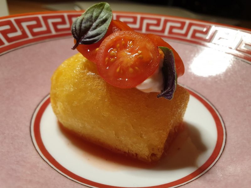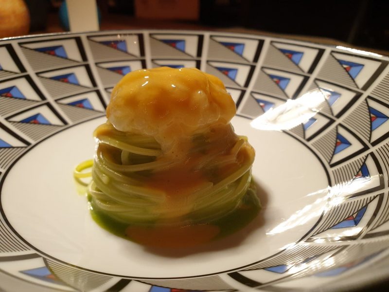 Spaghetti tra il golfo di Napoli e Hokkaido. Massimo è l’unico chef in grado di fondere il proprio stile personale con la capacità di raccontare L’Italia. La tradizione partenopea gamberi, quella orientale con i ricci di Hokkaido su un gazpaco di pomodori, cetrioli, carote, sedano e erbe aromatiche. Un incredibile boccone di mare e di orto che fa salivare, costruito con sapienza ed equilibrio tra i diversi elementi in cui la pasta fa da tapis roulant. La Habanera della Carmen di Georges Bizet, perchè l’amour est un oiseau rebelle (l’amore è un uccello ribelle) ed il mio pe rla pasta è conclamato.