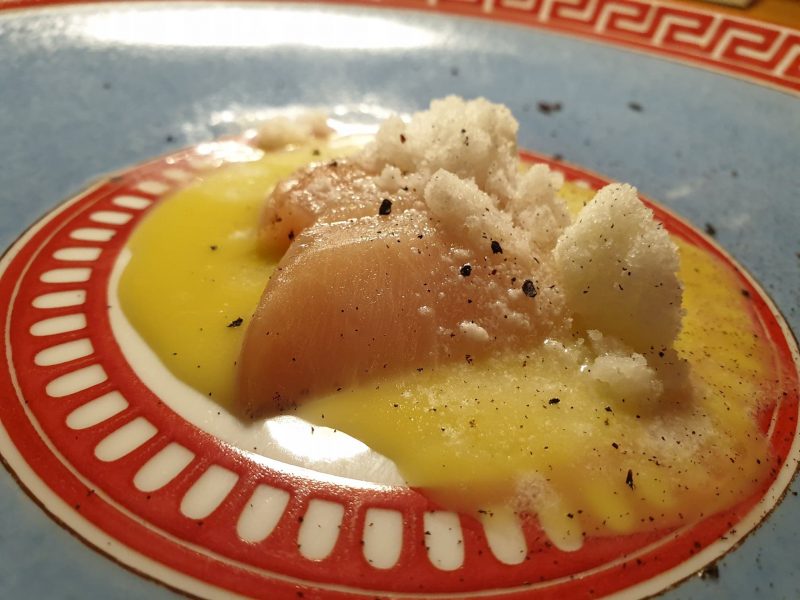Come una grigliata in astratto. Era il 2009, questo è stato il primo piatto con la mozzarella di bufala campana che mi fece capire che l’Italia della cucina d’autore era in rivoluzione. Una rivoluzione meravigliosa che staccava con tutto e prendeva nuove forme e nuovi sapori. Un piatto che mi lasciò senza parole, l’ho riprovato almeno un centinaio di volte nella mia testa. Era una ricciola, cruda, che però profumava di grigliato con degli oli essenziali al basilico, la bottarga, una gelatina di pomodoro e poi la mozzarella ghiacciata sopra. Un cazzotto in pieno mento di un peso massimo mi avrebbe sconvolto meno. Tutto profumava e sapeva di mare, di mediterraneo, con questa bufala sopra che rilasciava l’acidità poco alla volta, in un crescendo della bufala e degli altri ingredienti come avviene in un’opera lirica. Oggi aggiornato e se possibile migliorato.
