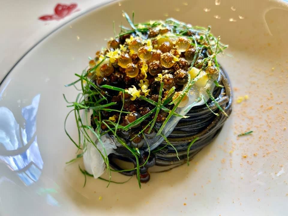 Osteria Gucci Massimo Bottura. Spaghetti al nero con crudo di seppia e uova di trota: voto 10 e lode