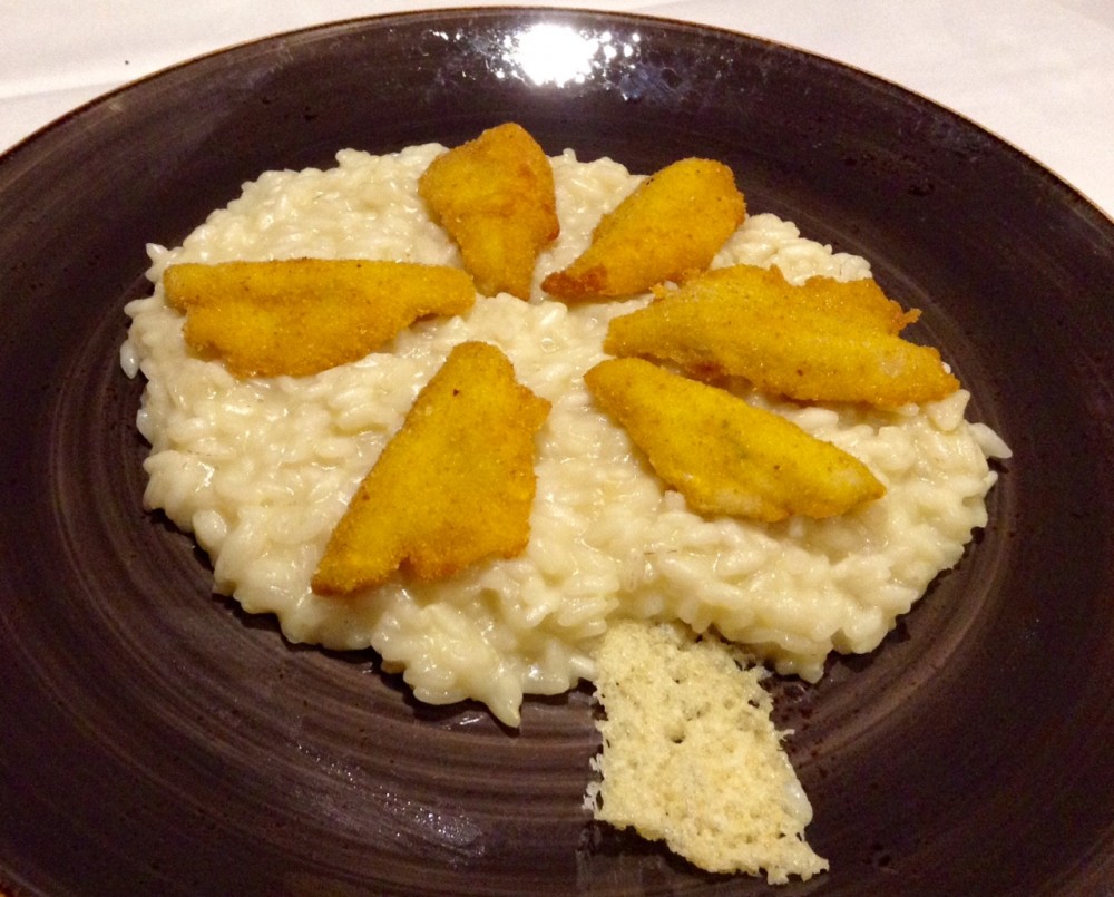Risotto alla parmigiana con filettini ben dorati di persico al burro e salvia, un piatto unico saporito e digeribile a miglia lacustri zero, un risotto di grande tradizione territoriale, impreziosito con sapienza tramandata da una risorsa locale, il persico.