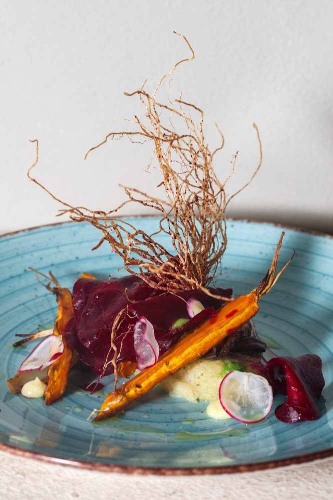 L’esempio clou può essere il sublime Tuberi e Radici. Un vegetariano calibrato e gustosissimo tra barbe, ravanelli, radici fritte, cipolle e brassica montana che esalta il piatto in stile “rafano” ma con maggior delicatezza.